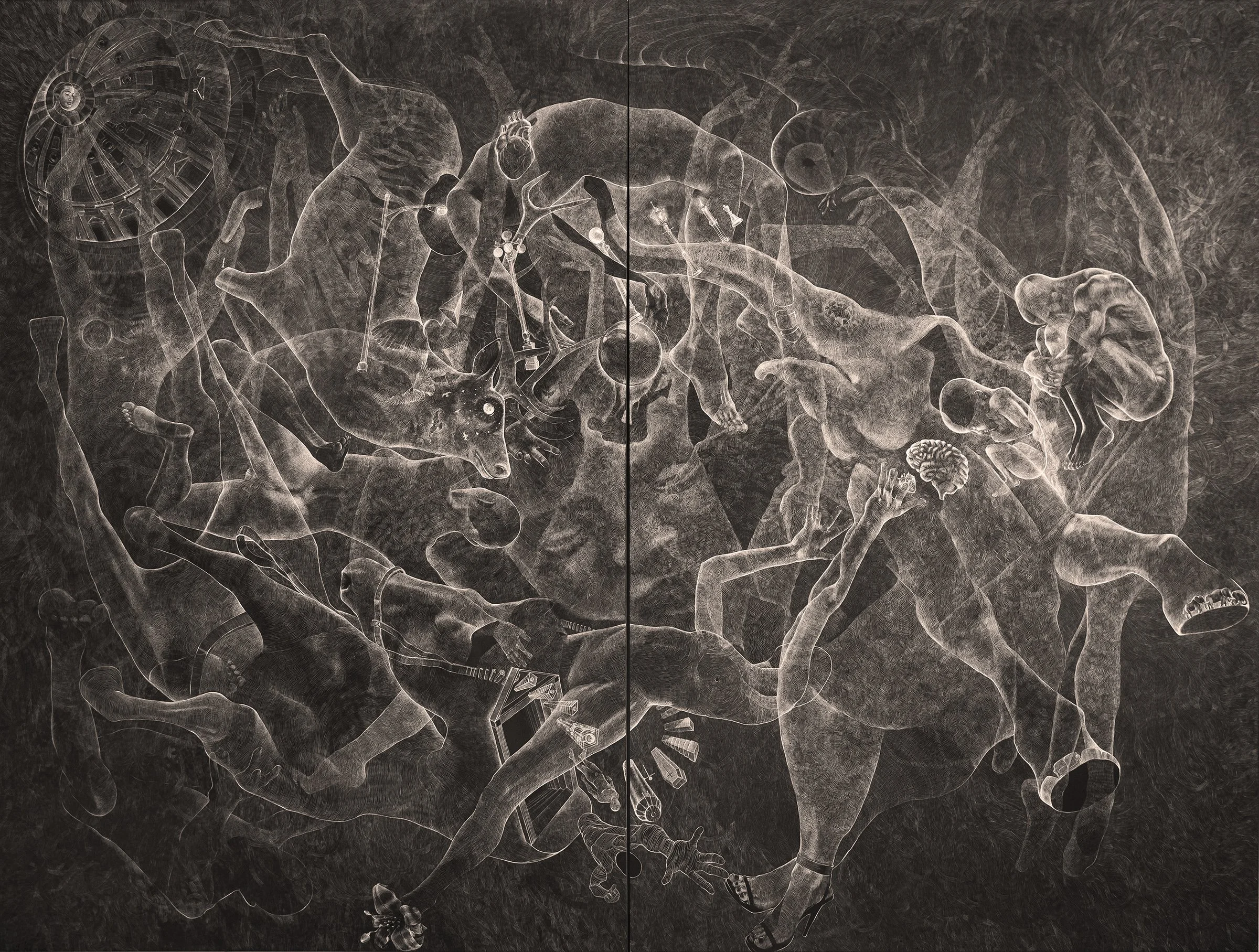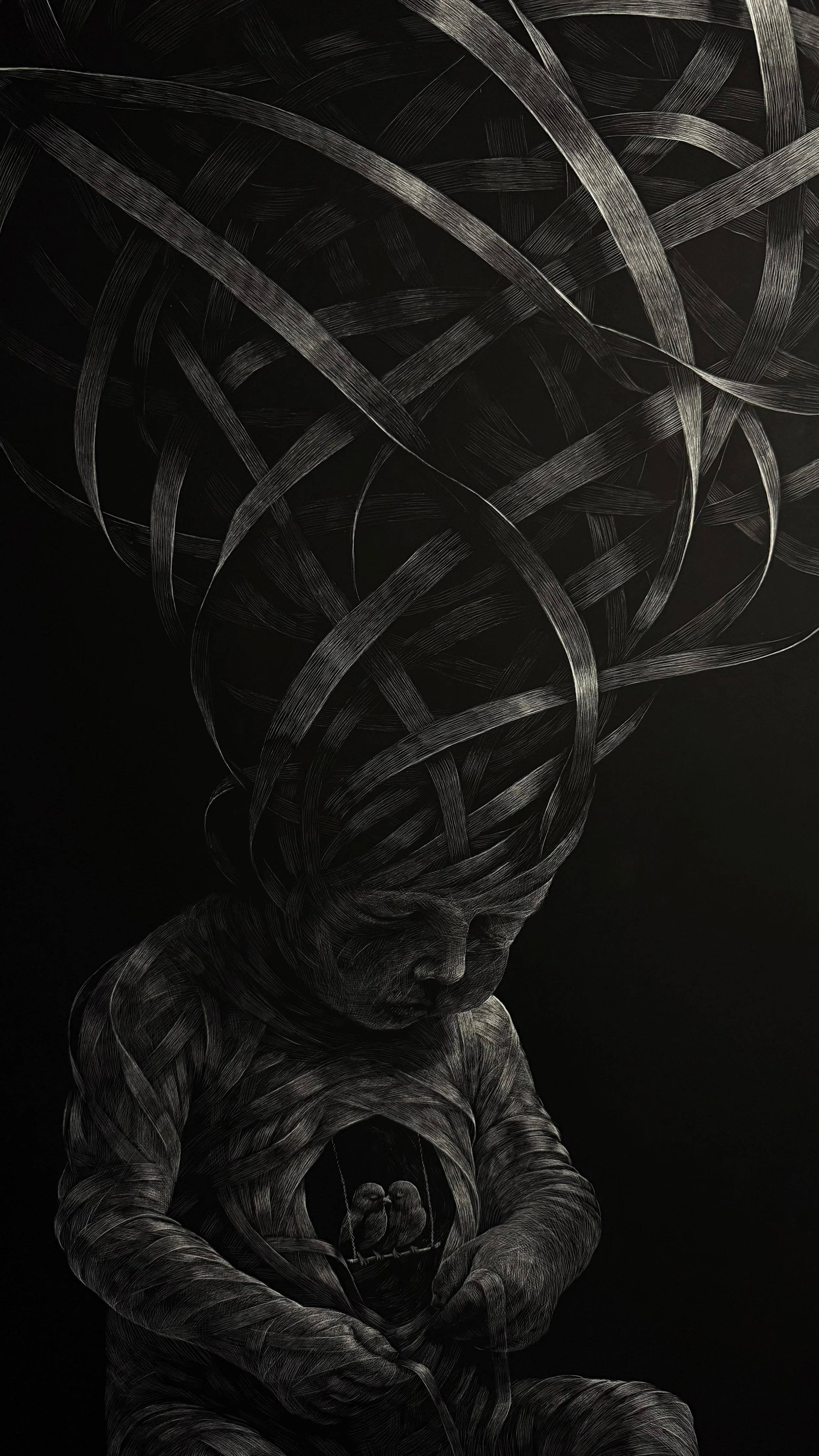 The scratch technique is the foundation of my practice. Each vision is carved into clayboard with nothing more than a single blade, line by line, stroke by stroke. Unlike drawing or painting, where marks are added, scratching is an act of removal—an excavation into darkness to reveal light…